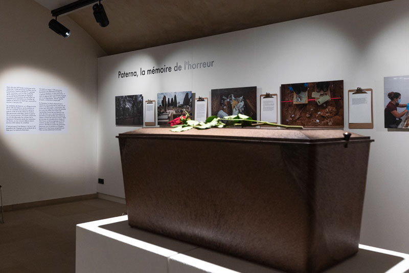 Divisée en trois parties, l’exposition matérialise une réflexion qui prend place cinquante ans après la mort du dictateur espagnol Francisco Franco. À l’entrée, dans l’atmosphère presque solennelle du centre culturel, le contour d’un carré marqué au sol rappelle les dimensions d’une fosse commune, où étaient déposé·es plusieurs centaines de fusillé·es. Des photos documentant les difficultés du travail archéologique dans les fosses ou encore des cordes utilisées pour menotter des prisonniers y précèdent des clichés de paysages de la région. En face de la tresse – symbole de la violence et de la stigmatisation subis –, une autre photo renvoie à une mémoire collective différente. On y voit un homme dans la vallée de Cuelgamuros au moment où il lève le bras pour faire le salut fasciste, le visage tourné vers le grand monument funéraire du franquisme, au centre. Bien que le dictateur soit mort en 1975, l’endroit attire encore des nostalgiques de nos jours.