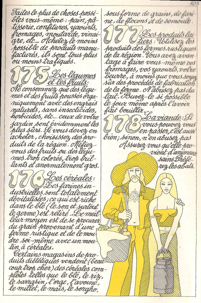Un peu moins fondamentaliste, mais plus utile en pratique pour celles et ceux qui voulaient trouver leur bonheur à la campagne : « The Complete Book of Self-Sufficiency », publié par John Seymour (1914-2004) en 1976 (2). Et pour cause : l’agronome britannique avait tenté de nombreuses expériences en élevage de plantes et d’animaux, entre autres en Afrique, avant que dans les années 1950 il ne s’installe avec sa compagne dans une ferme où les deux ont mis en pratique l’autosuffisance alimentaire.