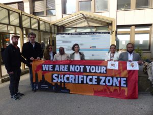 Une délégation de défenseurs·euses mexicain·es, brésilien·nes et luxembourgeois·es des droits humains et environnementaux s’est rendue au siège du sidérurgiste Ternium, à Luxembourg, le 2 mai. Ils n’ont pas obtenu d’entrevue. (Photo : Initiative pour un devoir de vigilance.)