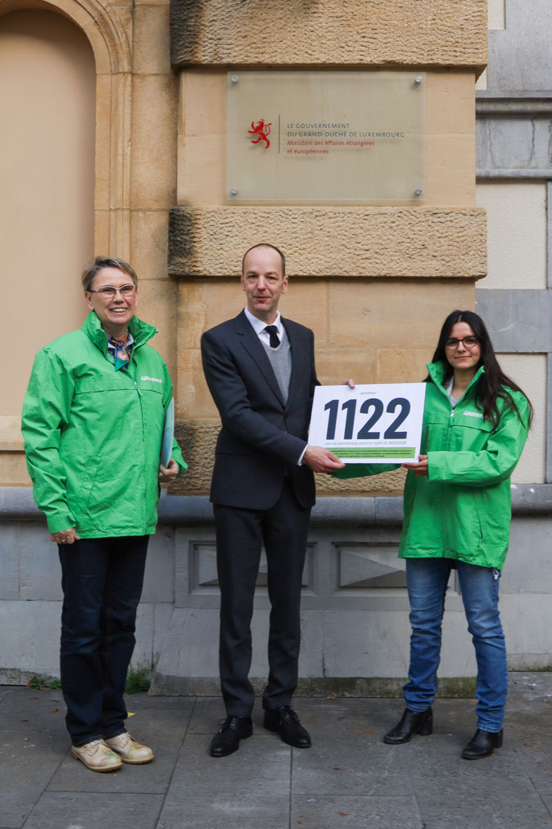 „Das Ministerium hat deutlich gemacht, dass Luxemburg das Abkommen als positiv sieht, trotz unserer Sorgen um die Auswirkungen auf die Umwelt, die indigenen Menschen und das Klima“, so Lis Cunha von Greenpeace nach dem Überreichen der Petition an einen Beamten des Außenministeriums. (Copyright: Anaïs Hector und Lara d’Antonio/Greenpeace)