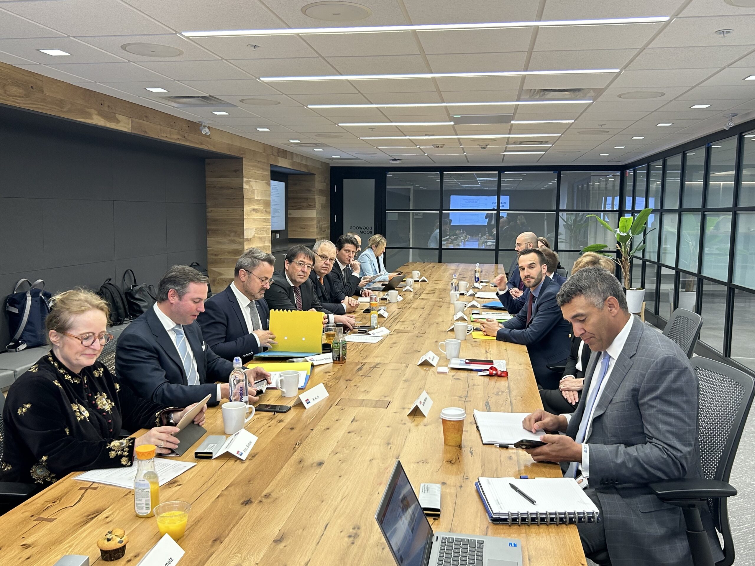 Erbgroßherzog Guillaume und Außenminister Xavier Bettel in einem Konferenzraum in Wilmington (USA). Mit am Tisch: Vertreter*innen des Chemiekonzerns DuPont. (Copyright: MAE)