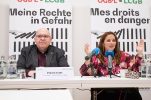« Nous sommes à 100 % sur la même longueur d’onde, nous sommes obligés d’avancer ensemble et le travail que nous faisons est historique », affirme Nora Back, la présidente de l’OGBL, en introduction d’une conférence de presse tenue dans les locaux de la Chambre des salariés, la maison commune des syndicats. « Nous avons été obligés d’avancer vite », ajoute le président du LCGB, Patrick Dury, pour qui les deux syndicats ont « la même mission : celle de défendre les intérêts des salarié·es et de s’engager en faveur de la justice sociale. Nous ne laisserons pas le gouvernement déréguler le droit du travail ». Dans les faits, les deux syndicats multiplient déjà les conférences de presse et actions communes ces derniers mois, et ils ont pris l’habitude de se rendre ensemble aux rendez-vous dans les ministères.