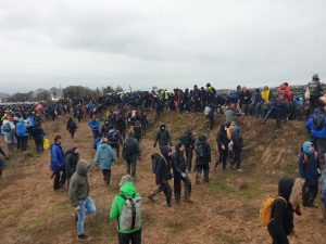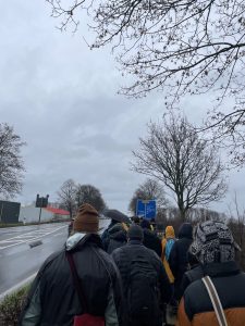 Die Shuttlebusse kommen dann auch irgendwann, es sind deren allerdings nur drei. Und so hat sich nach einer Stunde Wartezeit die mittlerweile völlig durchnässte Menschenmasse vor dem Erkelenzer Bahnhof nur unwesentlich reduziert. Um 12:15 dann die Ansage durchs Megafon: Die Busse stünden im Stau, einer sei ausgefallen, es werde dazu geraten, sich zu Fuß nach Keyenberg zu begeben. Wenn man schnell gehe, sei das Dorf innerhalb einer Stunde zu erreichen. Nicht wissend, ob an der Landstraße ein Gehweg entlang geht, zögern viele Demonstrant*innen zunächst. Nach und nach schlagen jedoch immer mehr den Fußweg nach Keyenberg ein.