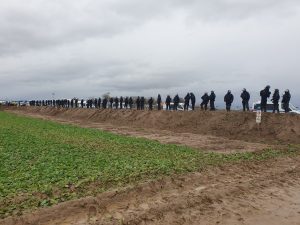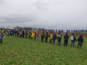 Gegen 16 Uhr bilden ein paar Dutzend eine Menschenkette vor den Barrikaden der Polizei. Von einem Demozug, der sich von dort aus in einer koordinierten Aktion nach Lützerath bewegt – wie im Nachhinein von der Polizei beschrieben – ist weit und breit nichts zu erkennen und das wird auch für den Rest des Nachmittags so bleiben. Vielmehr spazieren tausende Menschen über das Gelände, immer wieder ändern Polizist*innen ihre Position; dass sie damit auf die Demonstrant*innen reagieren, ist allerdings nicht erkennbar.