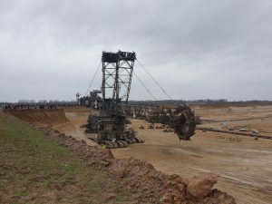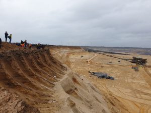 Etwa 250 Meter von der Bühne entfernt, wird das, wovon Thunberg spricht, greifbar. Der 40 Meter tiefe Tagebau ist so groß, dass man von einem Ende nicht bis zum nächsten sieht: 48 Quadratkilometer. An der Abrisskante stehen Menschen, um sich das Ganze anzuschauen. Der riesige Schaufelradbagger am Boden des Kraters wird von ein paar Dutzend Menschen mit gelben Westen bewacht. Was sie genau ausrichten sollen, sollten die Demonstrant*innen beginnen, den Tagebau zu stürmen, ist unklar.