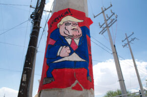 US-Präsident Trump und sein amerikanischer Traum, von mexikanischer Seite aus gesehen: Plakat vor dem Institut für Architektur, Design und Kunst an der Autonomen Universität von Ciudad Juárez. (Foto: Carolina Rosas Heimpel)
