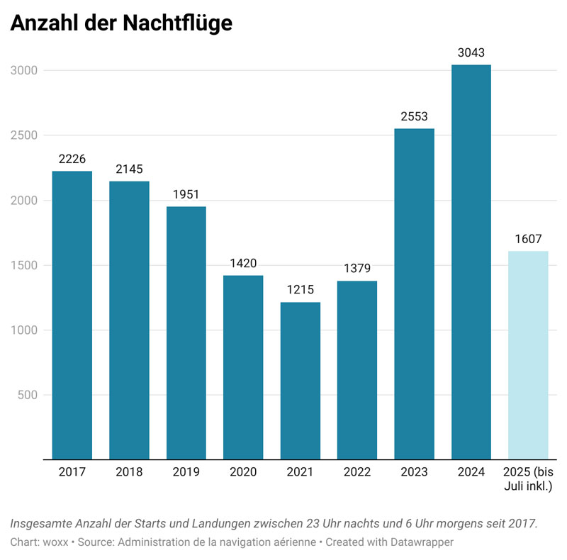 Die Zahl der Nachtflüge, die am Flughafen Findel starten und landen, hat sich in den letzten zehn Jahren beinahe verdoppelt: 2014 waren es laut der Datenbank der Flugsicherungsbehörde (Ana) 1.554, jedoch schon im Jahr 2023 kam man auf 2.553 und 2024 auf 3.034 Flüge, die die Nachtruhe störten. Zum Vergleich: Der Londoner Flughafen Heathrow – einer der verkehrsreichsten Flughäfen der Welt – verzeichnete 2024 rund 5.800 Nachtflüge, nicht mal doppelt so viele wie Luxemburg. Obwohl zwischen 23 und 6 Uhr eine Flugverbot gilt, gibt es mehrere Gründe für Ausnahmen, zum Beispiel wenn ein ankommender Flug sich verspätet. In den letzten Monaten scheint es aber für die von Fluglärm geplagten Anwohner*innen einen Lichtblick zu geben: Verglichen mit 2024 ist ein leichter Rückgang der Anzahl der Nachtflüge zu erkennen: Flogen im vergangenen Jahr zwischen Januar und Juli 1.761 Nachtflüge, so sind es im gleichen Zeitraum dieses Jahr mit 1.607 etwas weniger.