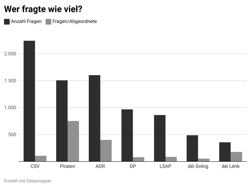 Die Piratepartei ist jedoch nur an dritter Stelle, was die Anzahl der Fragen angeht. Den zweiten Platz machte die ADR mit 1.602 parlamentarischen Anfragen. Die meisten Fragen stellte in der Legislaturperiode 2018 bis 2023 die größte Oppositionspartei, die CSV, nämlich 2.241. Die Abgeordneten der drei damaligen Regierungsparteien hatten weniger Fragen: Bei der DP waren es 967, die LSAP-Abgeordneten stellten 863 Anfragen und bei Déi Gréng waren es lediglich 488. Schlusslicht stellten die Abgeordneten von Déi Lénk dar, die insgesamt 356 Fragen stellten. In der kurzen Zeit, in der Roy Reding als Mitglied seiner neugegründeten Partei „Liberté Fräiheet!“ aufgeführt wurde, stellte er eine einzige Frage.
