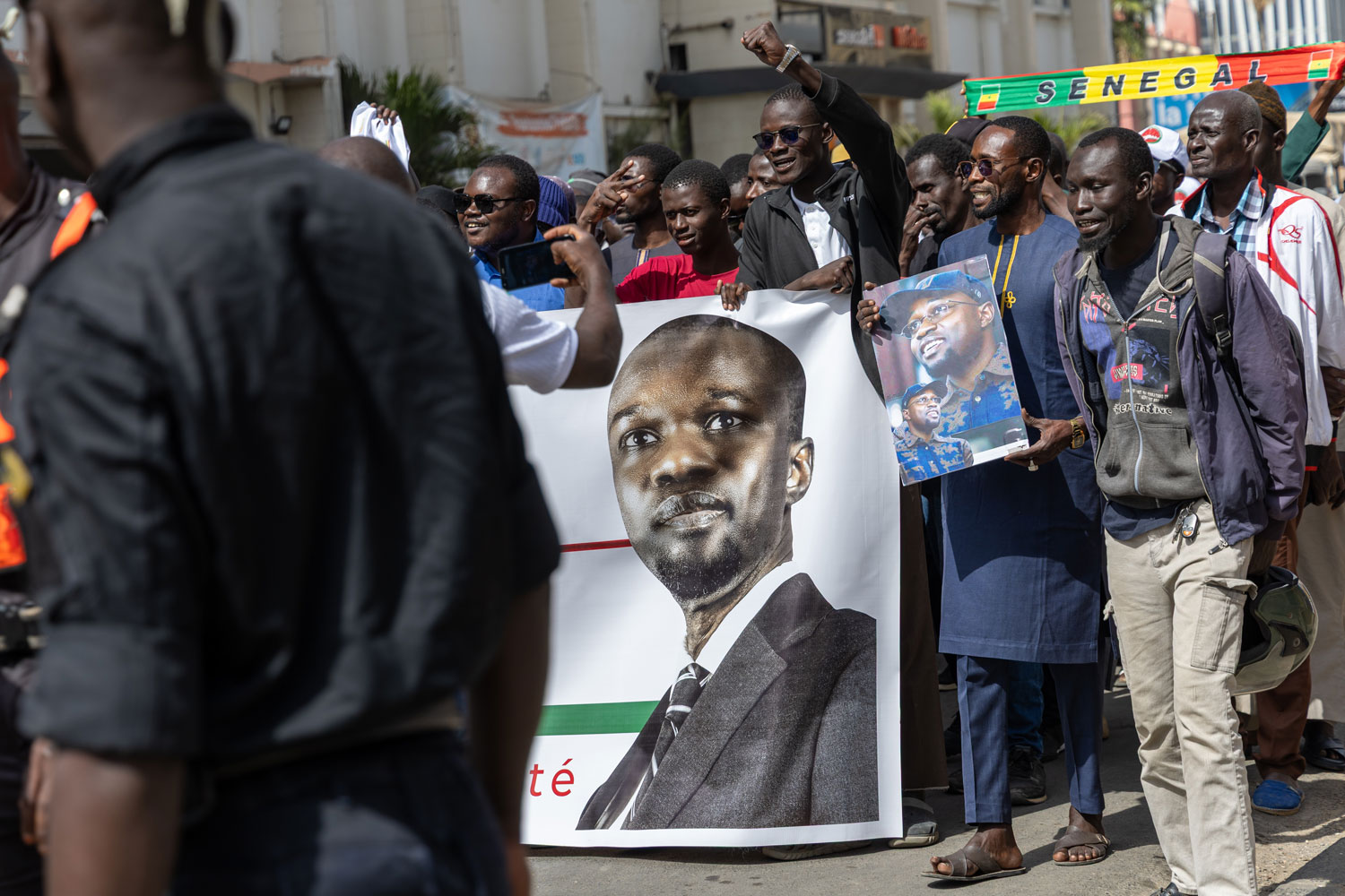 Marsch gegen Homosexualität. Anfang März in der senegalischen Hauptstadt Dakar: Einige der Demonstrierenden führen ein Transparent mit dem Konterfei des Premierministers Ousmane Sonko mit sich, auf dessen Initiative die verschärfte Kriminalisierung von LGBTIQA+-Personen zurückgeht. (EPA/JEROME FAVRE)