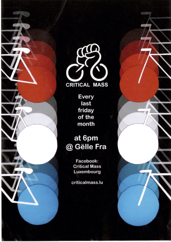 Nach dem großen Erfolg des "Reclaim the Streets" vom vergangenen Samstag, gibt es eine knappe Woche später eine weitere Möglichkeit, für das Radfahren in Luxemburg-Stadt zu demonstrieren. Wie jeden letzten Freitag im Monat treffen sich am 30. April ab 18 Uhr Radfahrer*innen bei der „Gëlle Fra“ um ihr Anliegen „sichtbar“ zu machen. Das Konzept...