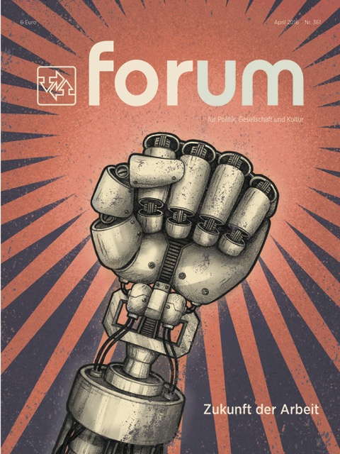 Auf dem Cover des Forum-Hefts vom April ist eine Roboter-Faust abgebildet, die für die „Digitalisierung der Arbeitswelt“ und die „Revolution der unterdrückten Maschinen“ steht. Wer nun Cyberpunk erwartet, wird enttäuscht. Wenn aber jemand daran interessiert ist, was die Direktorin der Adem zum Dossier-Thema „Zukunft der Arbeit“ zu sagen hat,...
