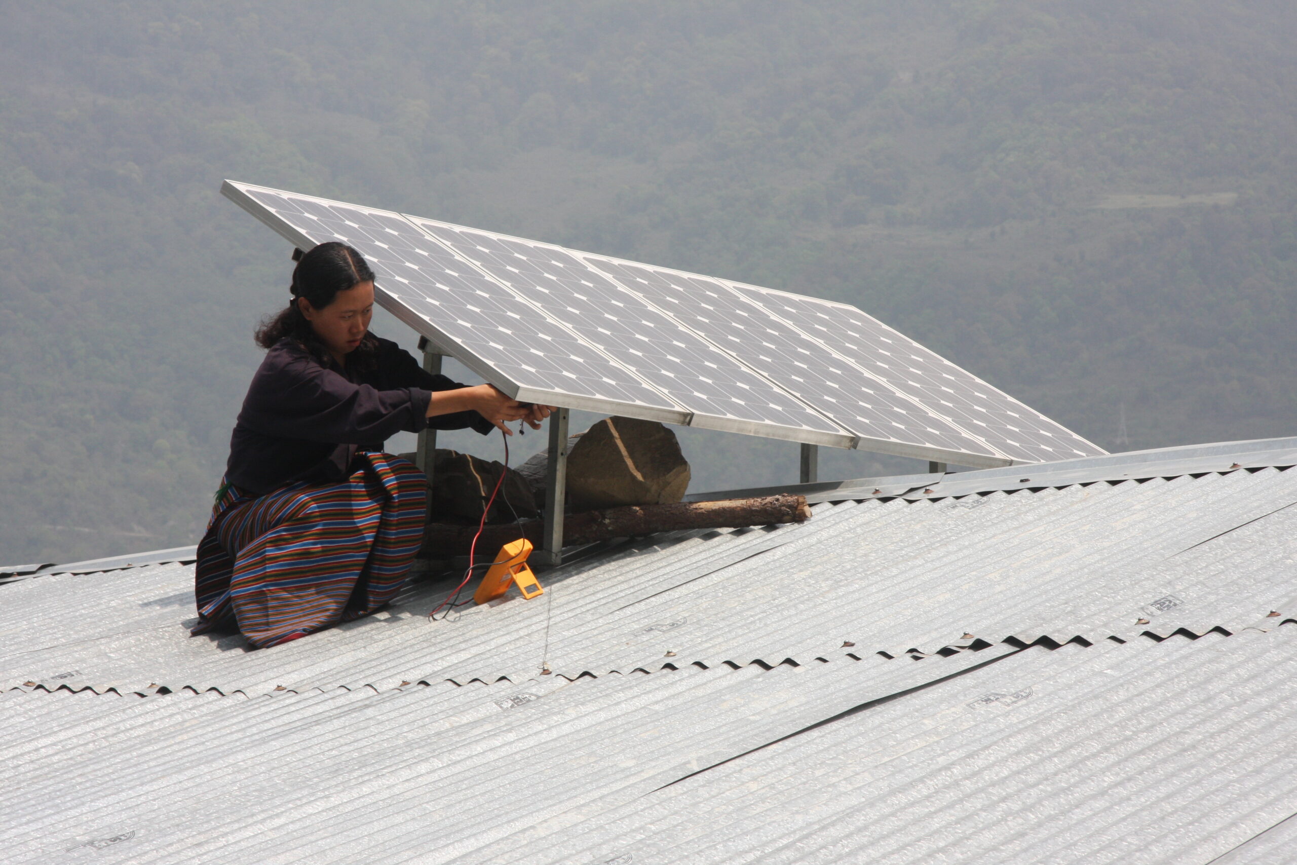 Eine Frau installiert Sonnenkollektoren auf einem Dach in Bhutan. Das Projekt wird von der Asiatischen Entwicklungsbank finanziert und erhält internationale Finanzhilfen, in diesem Fall von den USA. (Bildquelle: Asian Development Bank, CC BY-NC-ND 2.0)