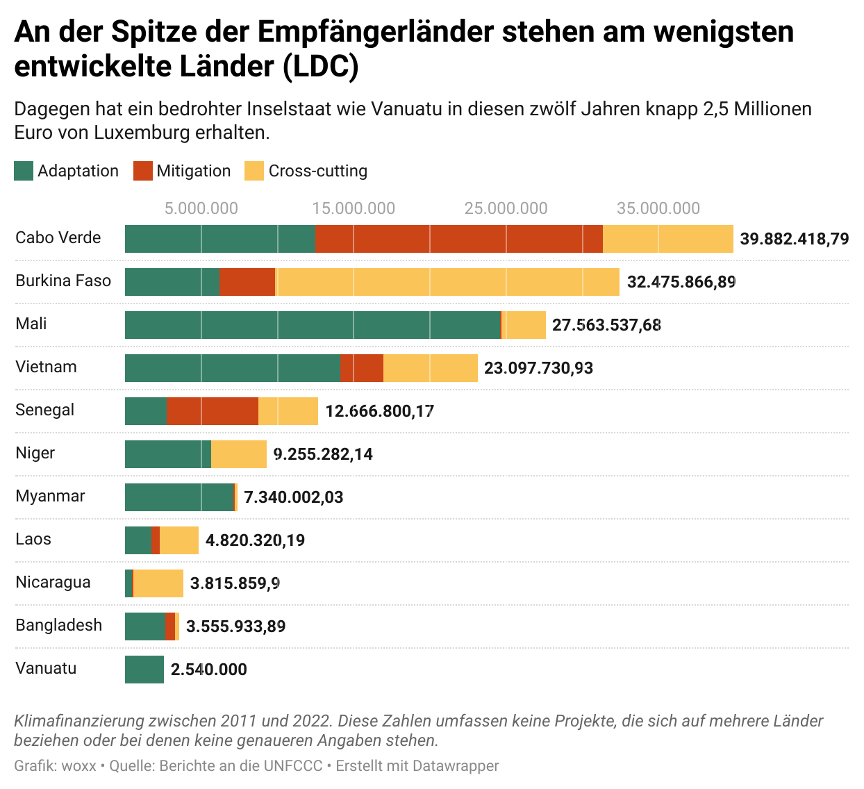 So finden sich unter den von Luxemburg kofinanzierten Projekten solche, die den biologischen Anbau fördern oder etwa die Installation von 30 solarbetriebenen Wasserpumpen auf Vanuatu. Der rund 80 Inseln umfassende Staat im Südpazifik gilt als kleines Inselentwicklungsland (Sids), dessen Existenz ist vom steigenden Meeresspiegel akut bedroht. Zusammen mit den am wenigsten entwickelten Ländern (LDC) wie Benin oder Mali, die mit am stärksten von der Klimakrise betroffen sind, werden die Sids der Regierung zufolge bei der Klimafinanzierung Luxemburgs priorisiert. In der Tat stehen an der Spitze der Empfängerländer auch fünf LDC und ein Sids. Burkina Faso, Cabo Verde, Niger, Mali, Senegal, Vietnam und Laos gehören zu den Ländern, die zwischen 2011 und 2022 am meisten Geld erhalten haben – wenigstens aufgrund jener Beträge, in denen die oft unklaren Berichte ein Land beim Namen nennen. Bei rund der Hälfte der Beträge – satte 217 Millionen Euro – gibt es keine genauen Angaben zum Empfängerland.
