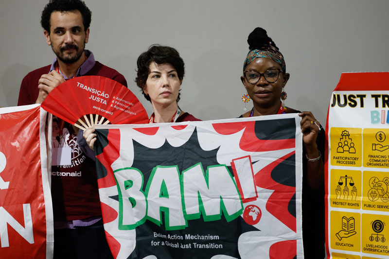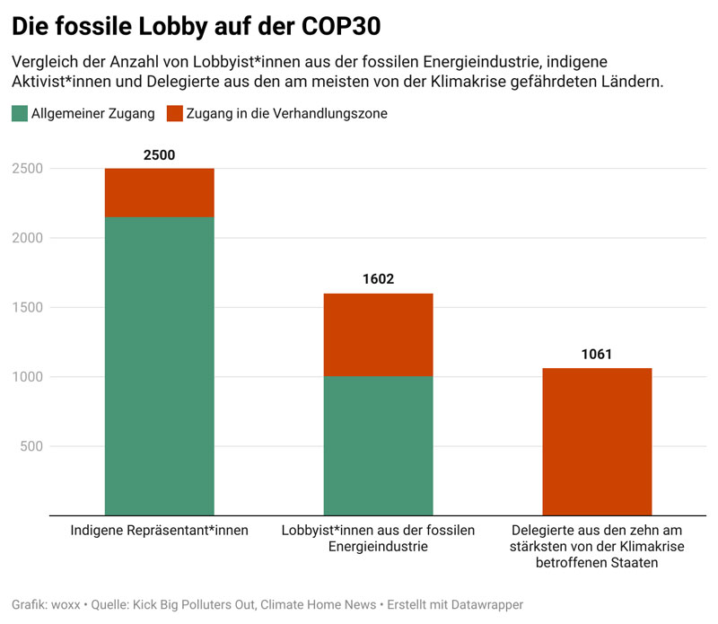 Der Gegenwind aus vielen Ölstaaten, darunter Saudi Arabien, ließ nicht lange auf sich warten. Den Rücken stärkten ihnen die Öl- und Erdgas-Lobby der fossilen Industrie, die in Belém wie nie zuvor in die Verhandlungen eingriff: Einer Recherche der Koalition „Kick Big Polluters Out“ zufolge waren insgesamt 1.602 Lobbyist*innen aus diesem Sektor vor Ort – mehr Personen als die Delegierten der zehn am meisten von der Klimakrise gefährdeten Staaten. „Es ist empörend zu sehen, wie ihr Einfluss Jahr für Jahr zunimmt und den COP-Prozess lächerlich macht“, reagierte ein Mitglied der Koalition in einem Presseschreiben. Niemand konnte den Erdölstaaten die Stirn bieten: Die USA war abwesend, China an einer Führungsrolle nicht interessiert und die EU intern zerstritten.